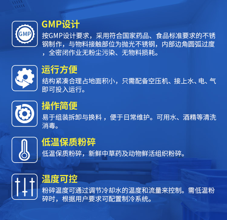 2.易拆卸(組裝)、易清洗、易換料??捎盟?、壓縮空氣、酒精、蒸汽等清洗、消毒?!龇鬯檫^程全密閉無粉塵溢出,充分改善作業(yè)環(huán)境,粉碎物料及其有效成份不損失。
